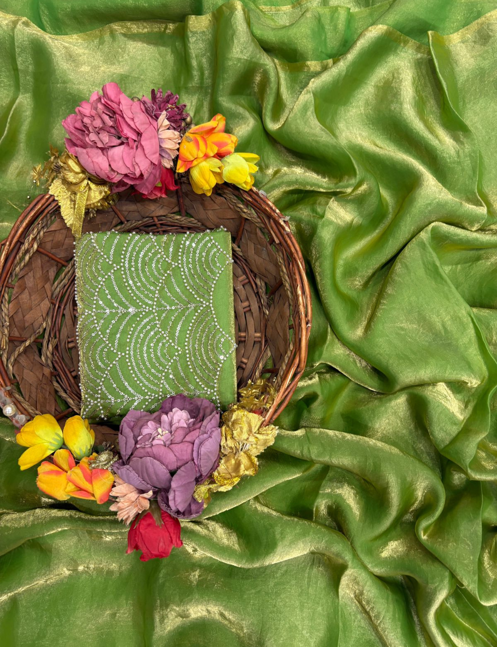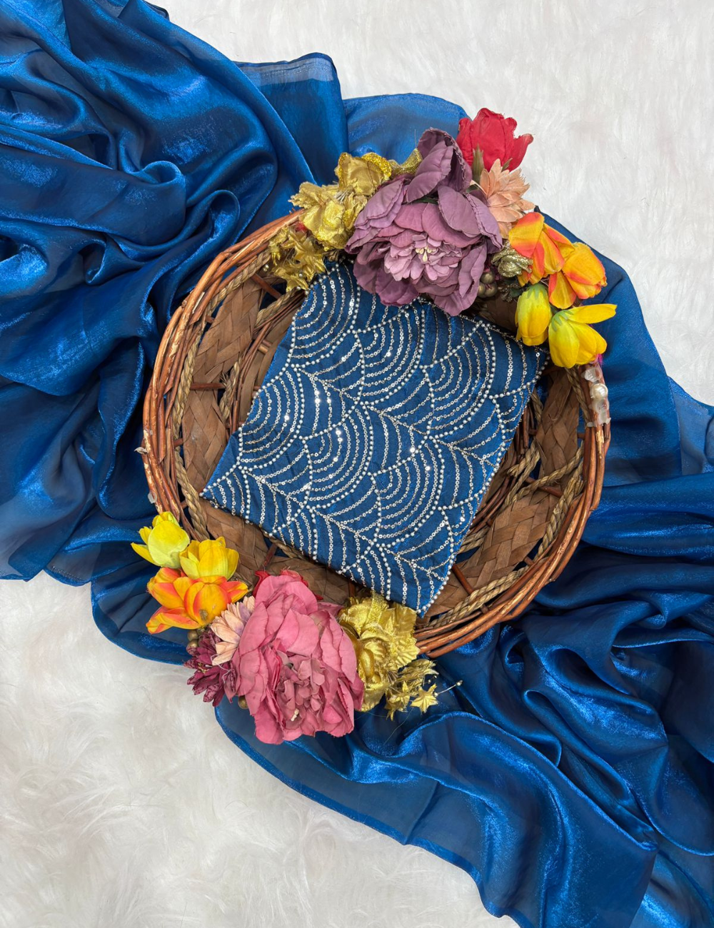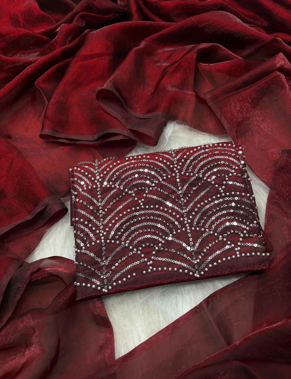 Graceful and striking, this Fandy Satin Saree is designed for modern elegance with a traditional essence. The smooth satin fabric flows effortlessly, enhanced with dazzling crystal wave embroidery that adds a radiant sparkle to your look. Lightweight yet luxurious, it’s a perfect choice for cocktail evenings, festive occasions, or receptions where you want to shine with subtle glamour.