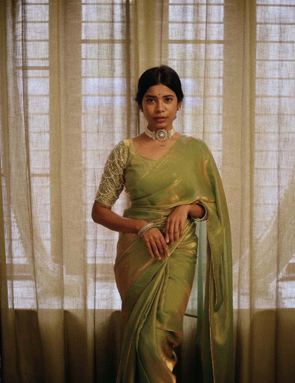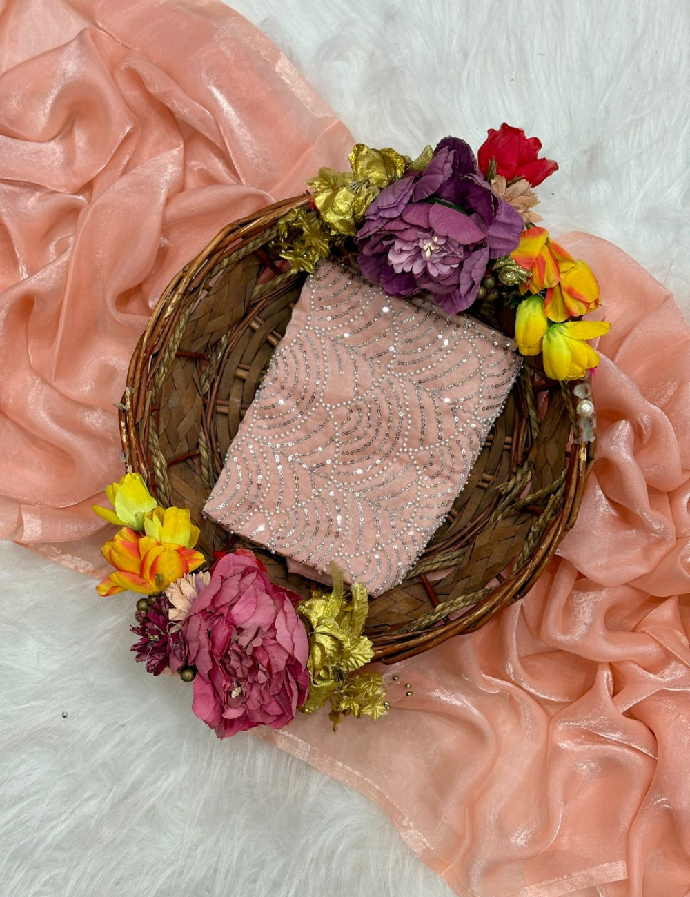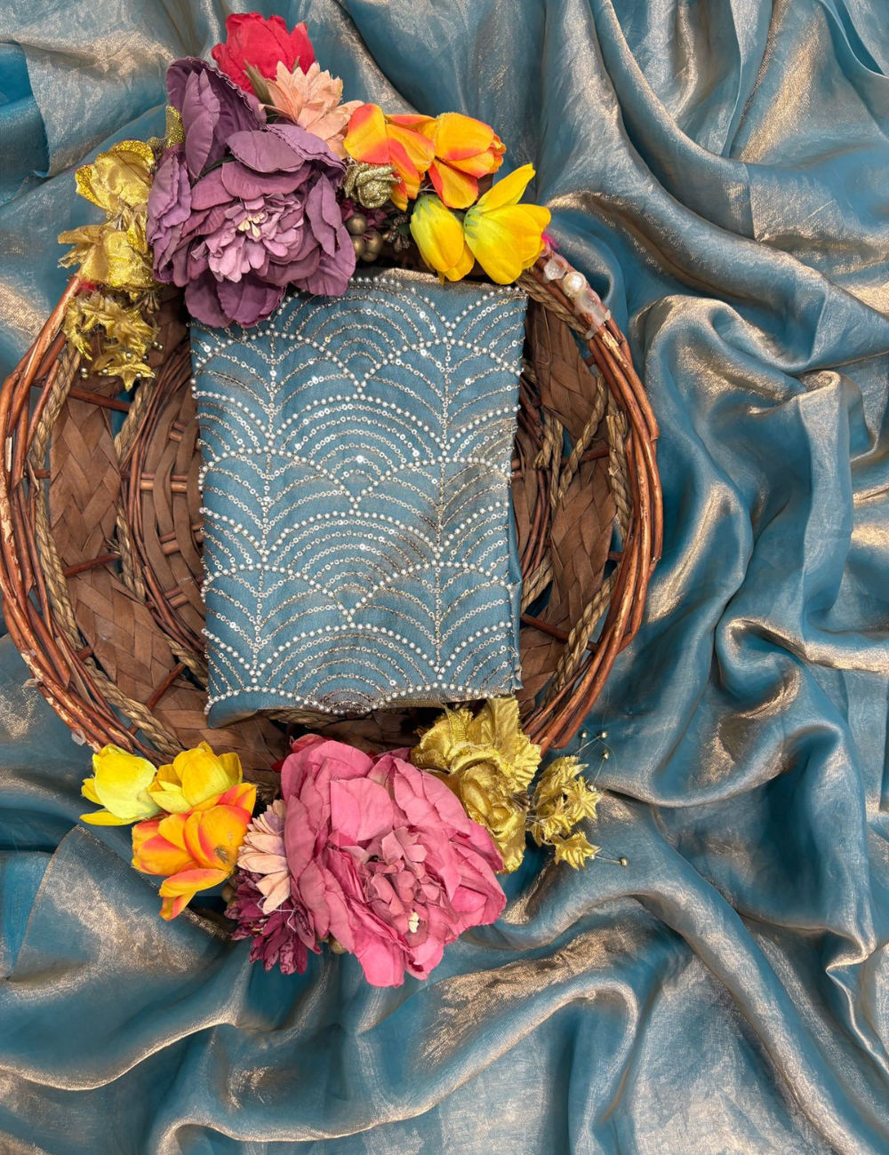 Graceful and striking, this Fandy Satin Saree is designed for modern elegance with a traditional essence. The smooth satin fabric flows effortlessly, enhanced with dazzling crystal wave embroidery that adds a radiant sparkle to your look. Lightweight yet luxurious, it’s a perfect choice for cocktail evenings, festive occasions, or receptions where you want to shine with subtle glamour.