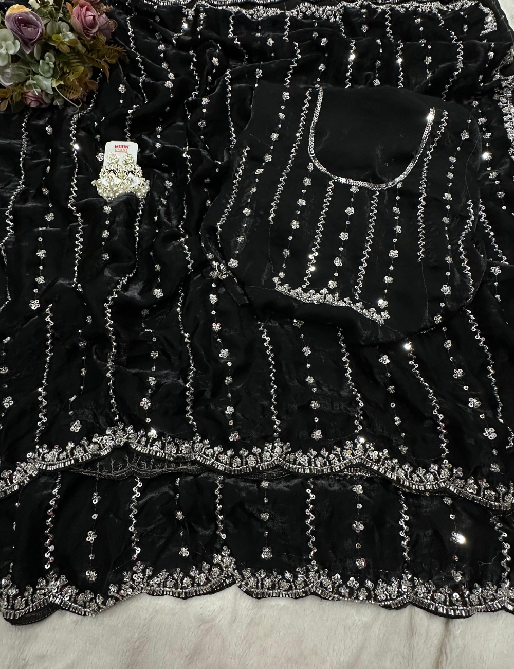 This saree offers a comfortable and graceful drape, making it ideal for grand celebrations, evening parties, and festive occasions. The minimalist yet impactful design ensures that the exquisite hand-worked beads are the focal point, allowing you to shine with understated glamour.
