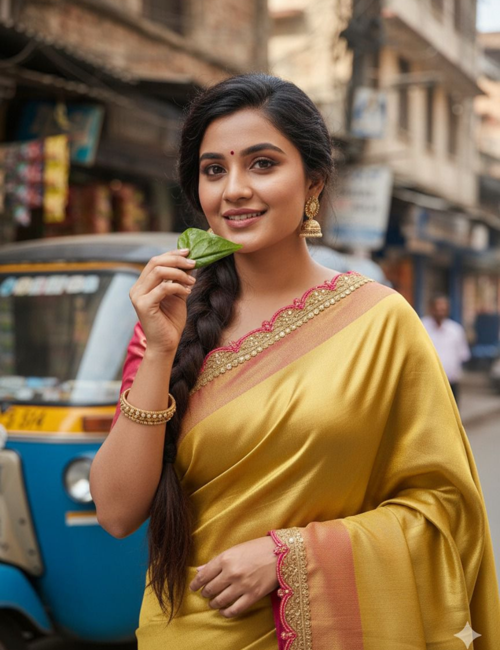 This stunning saree is made from soft tissue silk, showcasing a radiant golden body paired with a rich coppery pink border. The border features intricate sequin and lace embellishments, adding a touch of festive elegance. Lightweight and smooth, the saree offers a luxurious drape perfect for celebrations and special occasions.