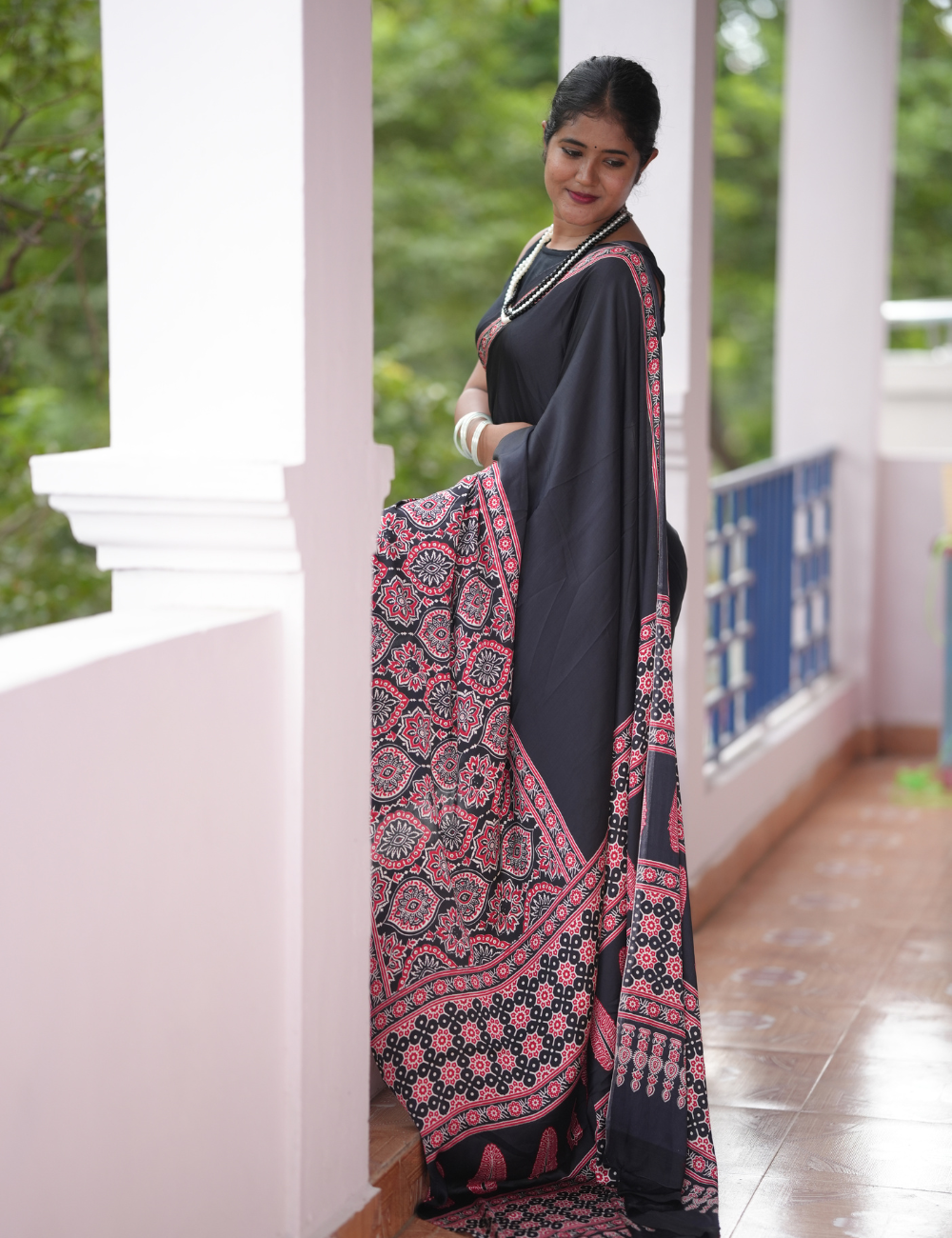 The saree features intricate Ajrakh block printing, a traditional art form known for its rich history and mesmerizing geometric and floral patterns. The vibrant hues and detailed motifs are a testament to the skilled artisans who bring this heritage to life. Complementing the Ajrakh print is the delicate Bandhej (tie-dye) work, adding a touch of subtle texture and visual interest.