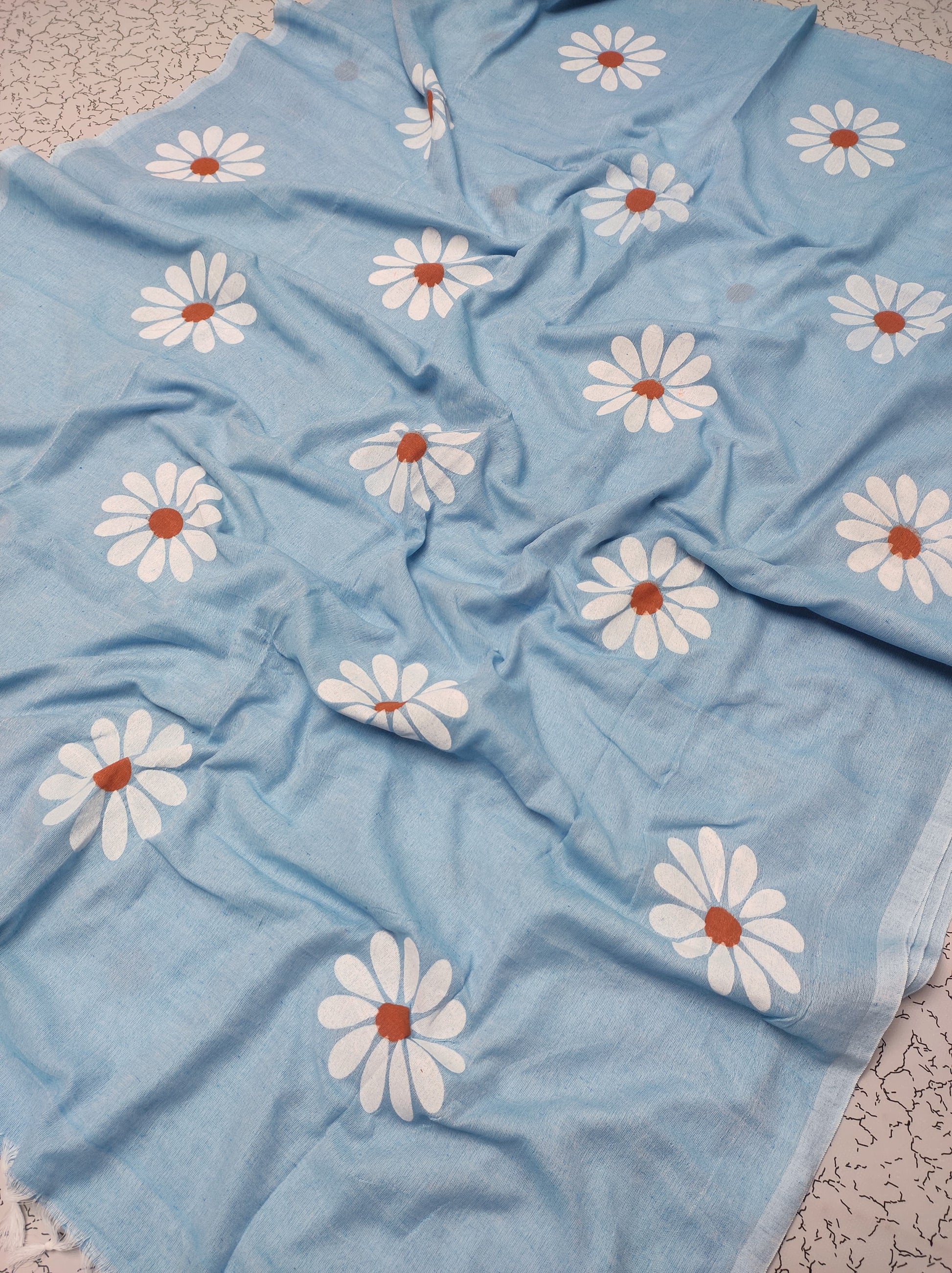 Bring cheer and charm to your wardrobe with this Khadi Cotton Saree in a subtle sky Petal. Adorned with playful white daisy prints, this saree blends comfort with a breezy, youthful appeal. The breathable khadi fabric makes it perfect for everyday wear, casual outings, or summer festivities, while its effortless drape ensures all-day comfort with style.