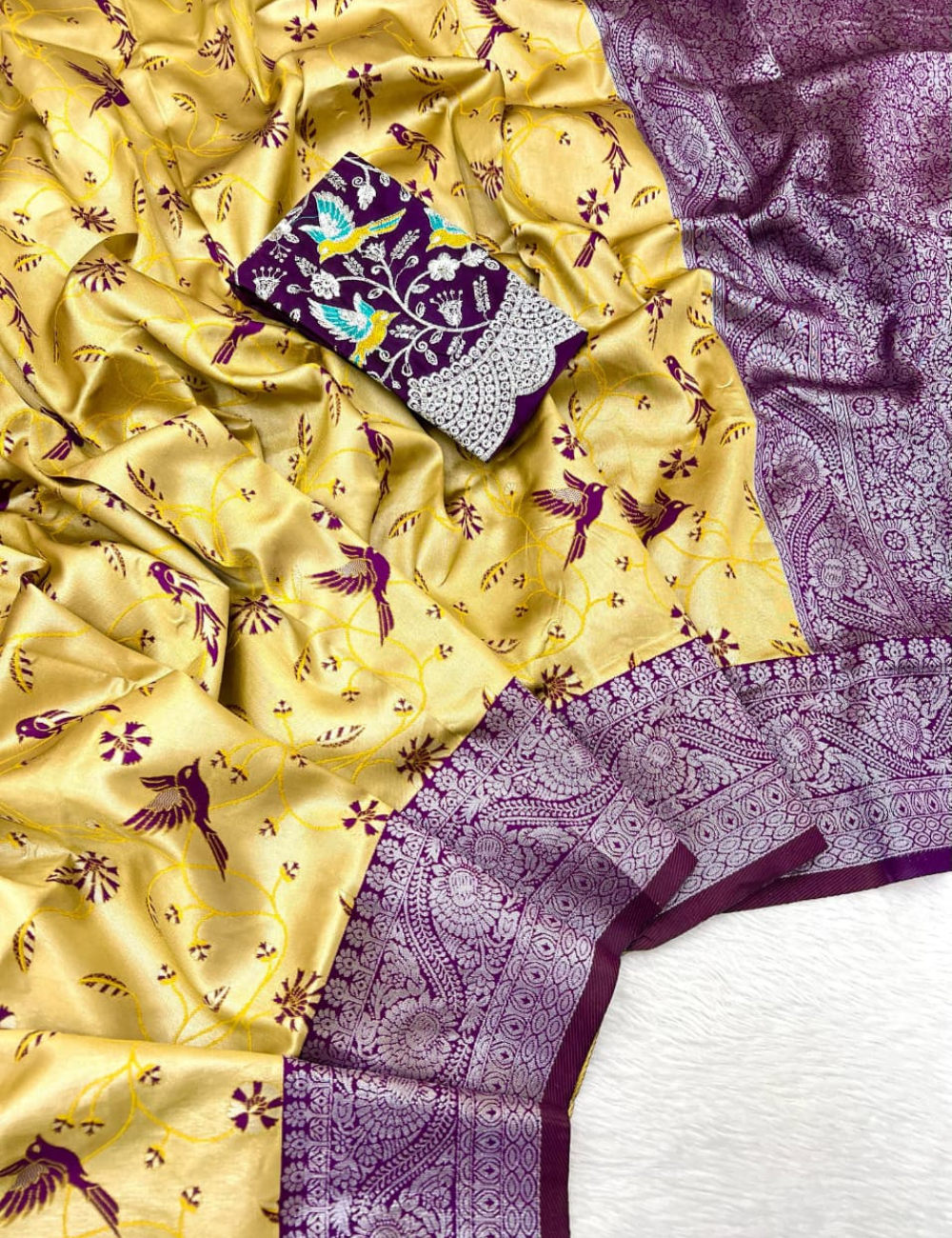 This exquisite saree is made from authentic Kanchipuram silk, featuring a rich blend of teal and gold tones. The body is adorned with elegant bird motifs, while the pallu and border showcase intricate floral zari weaving for a touch of timeless grandeur. Paired with a beautifully embroidered blouse that complements the saree, this ensemble is perfect for weddings, festivals, and grand celebrations.